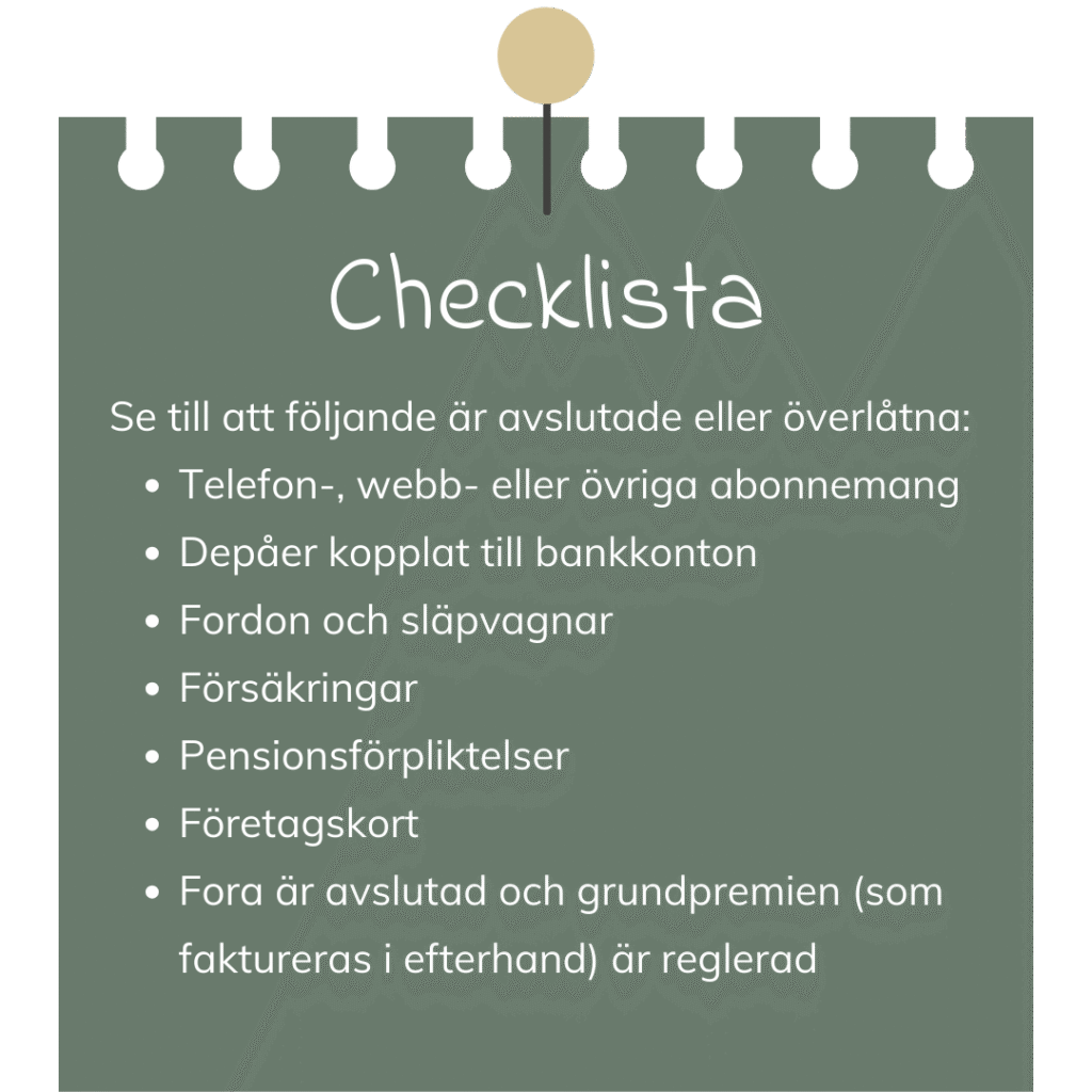 Alla abonnemang och avtal (förutom bank) ska vara avslutade eller överlåtna (se checklistan).